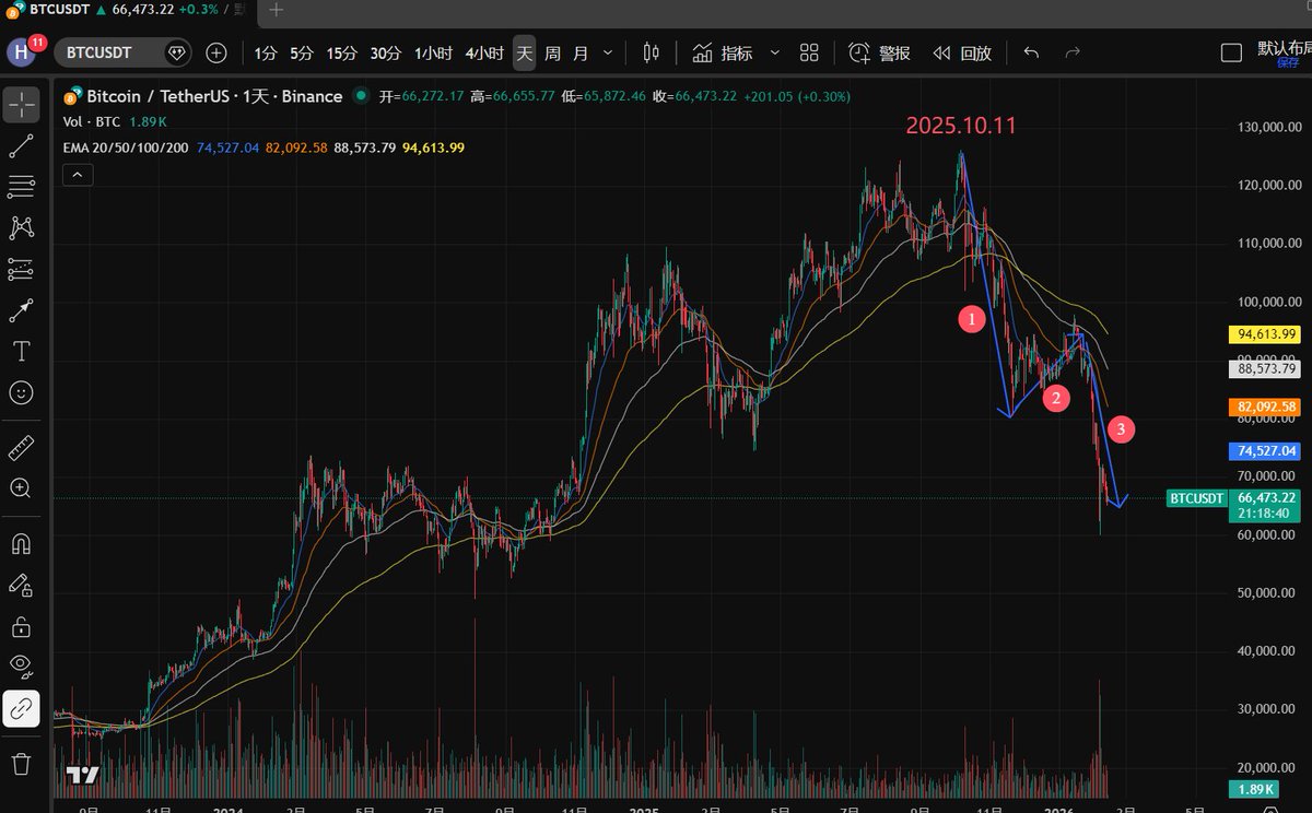 I'm not very technically savvy, but from the perspective of "marking the boat to find the sword" (a metaphor for clinging to outdated methods), BTC, starting from the 10.11 event, the first phase directly trapped people, catching them off guard by the bull market momentum. The second phase was the killing phase, the most ruthless, uprooting those who believed the bull market was still going strong, or those who were trapped and refused to admit defeat! The third phase forced people to sell at a loss, essentially confirming the bear market. Those with weak resolve or excessive leverage would be wiped out. But... the most despairing phase isn't even this one. The first three phases actually perfectly match the bear market rhythm of the "marking the boat to find the sword" method. If this pattern continues, there should be a truly "desperate" market phase later, a continuous, small-scale decline until everyone is numb, no longer paying attention, no longer discussing, and no longer hoping. This process isn't achieved through price drops, but through grinding! This is the process of the last bull market turning into a bear market. Phase 1, 2, and 3 completely correspond. Phase 4 is the continuous, gradual decline. Note that both charts are daily charts.