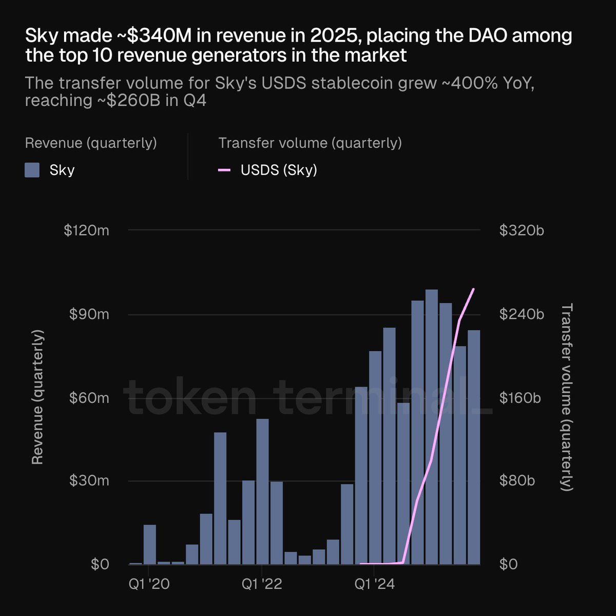 Sky's revenue in 2025 is estimated at approximately $340 million, placing it among the top ten decentralized autonomous organizations (DAOs) in terms of market revenue. @SkyEcosystem's USDS stablecoin trading volume increased by approximately 400% year-over-year, reaching approximately $260 billion in the fourth quarter.