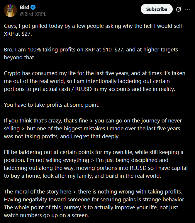 Some community members question why a selling target is being discussed now, given that XRP's price hasn't yet returned to levels like $4 or $10. However, others believe Bird's comments serve as a helpful reminder about risk management.