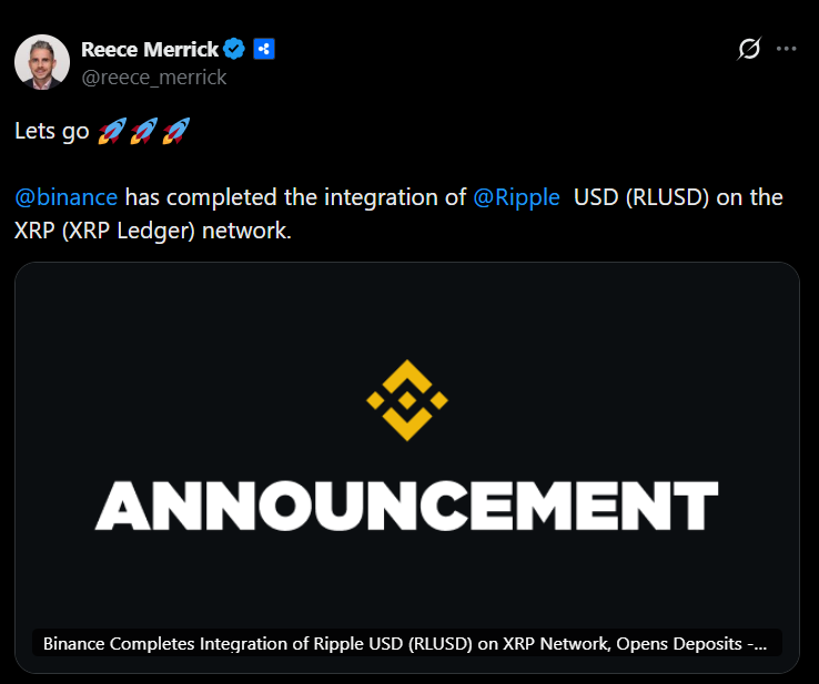 Reece Merrick, Managing Director of Ripple Middle East and Africa, warmly welcomed this development. He posted "Let's Go!" on the X platform to celebrate Binance's completion of the RLUSD integration onto the XRP Ledger network.