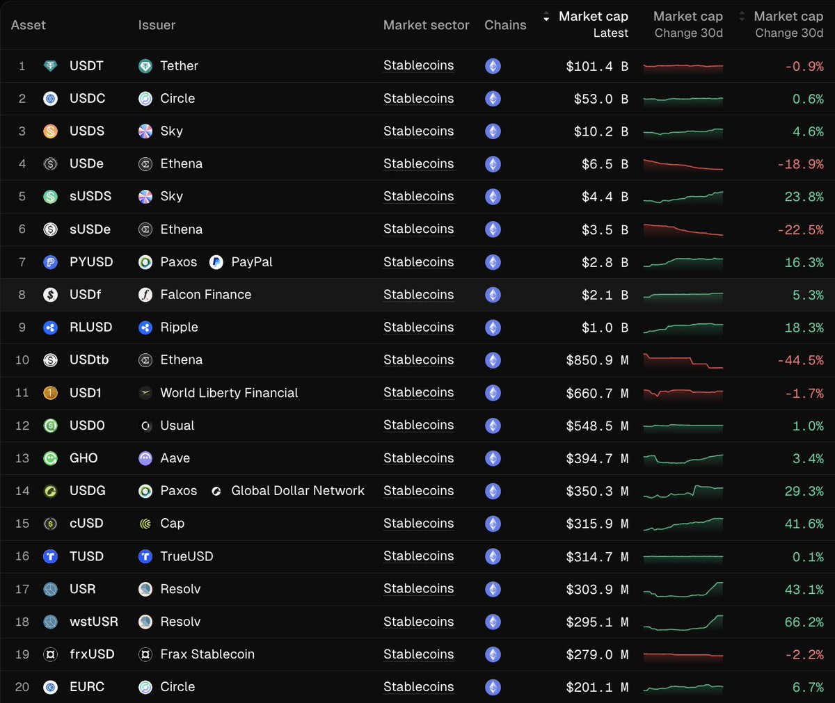 What is the eighth largest stablecoin by market capitalization on Ethereum? It's USDF from FalConfinance, with a market capitalization of $2.1 billion.