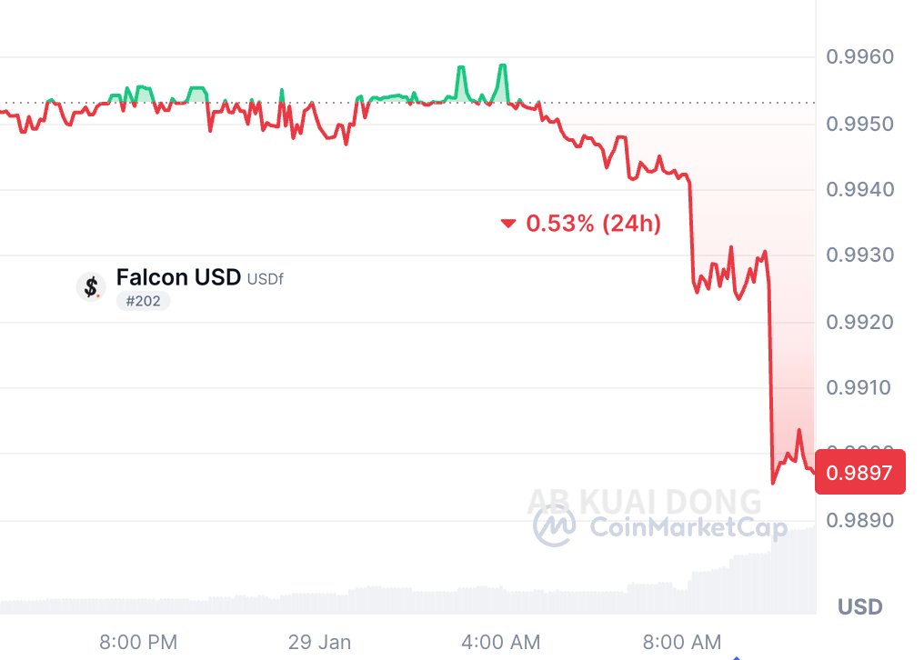 Falcon, incubated by market maker DWF, has seen its synthetic stablecoin USDf de-pegged. Currently, its price on CMC is $0.0989, while its price on the Pancake blockchain is $0.9895. This is the lowest price Falcon has ever received since its inception after de-pegging.
