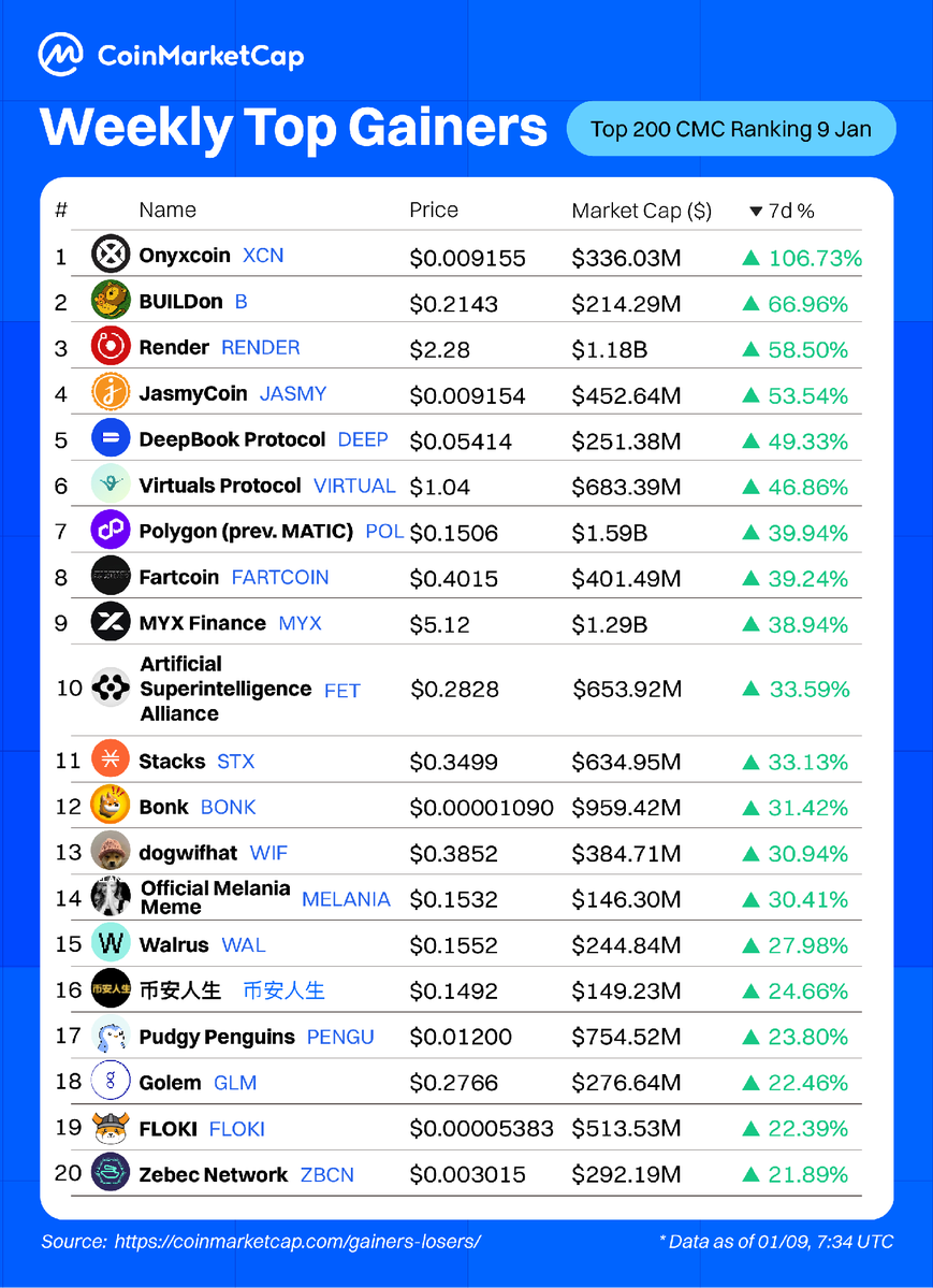 Weekly Top Gainers 1️⃣ @Onyx: +106.73% 2️⃣ @BUILDonBsc_AI: +66.96% 3️⃣ @rendernetwork: +58.50% 4️⃣ @JasmyMGT: +53.54% 5️⃣ @DeepBookonSui: +49.33% 6️⃣ @virtuals_io: +46.86% 7️⃣ @0xPolygon: +39.94% 8️⃣ @FartCoinOfSOL: +39.24% 9️⃣ @MYX_Finance: +38.94% 🔟 @ASI_Alliance: +33.59%
