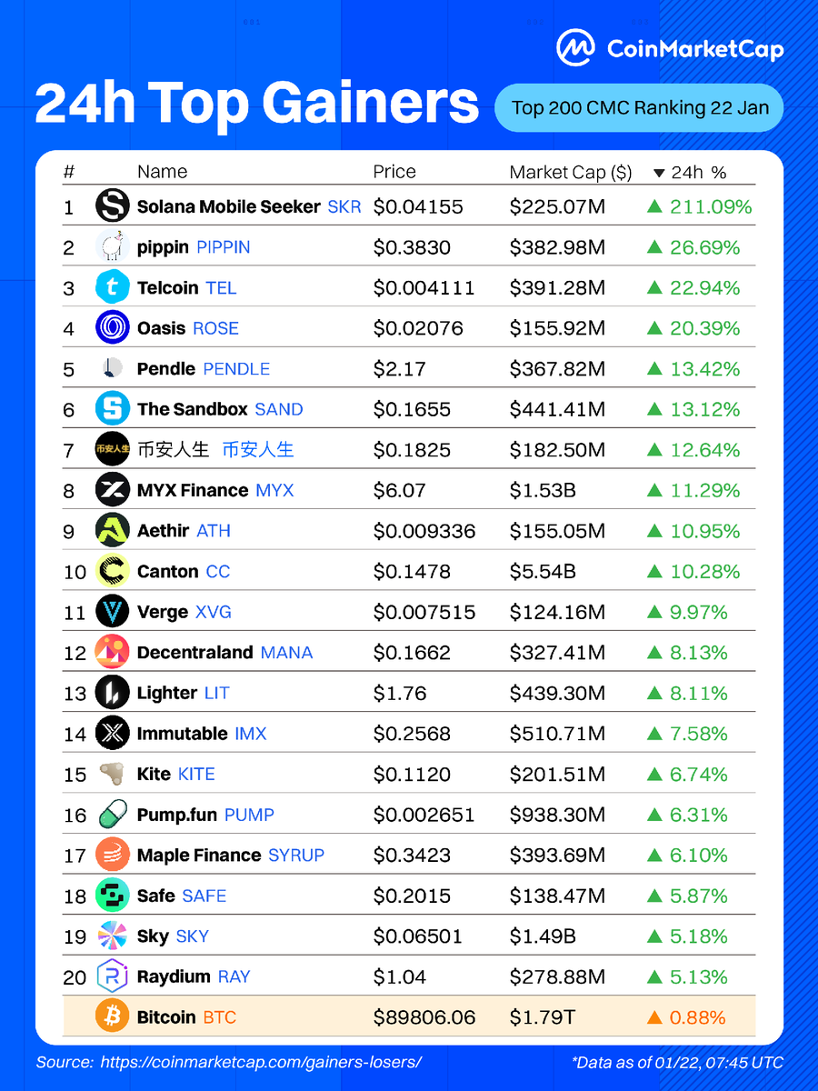 24-hour Top Gainers 👇 1️⃣ @solanamobile: +211.09% 2️⃣ @pippinlovesyou: +26.69% 3️⃣ @telcoin: +22.94% 4️⃣ @OasisProtocol: +20.39% 5️⃣ @pendle_fi: +13.42% 6️⃣ @thesandboxgame: +13.12% 7️⃣ 斌安人生: +12.64% 8️⃣ @MYX_Finance: +11.29% 9️⃣ @AethirCloud: +10.95% 🔟 @CantonNetwork: +10.28%