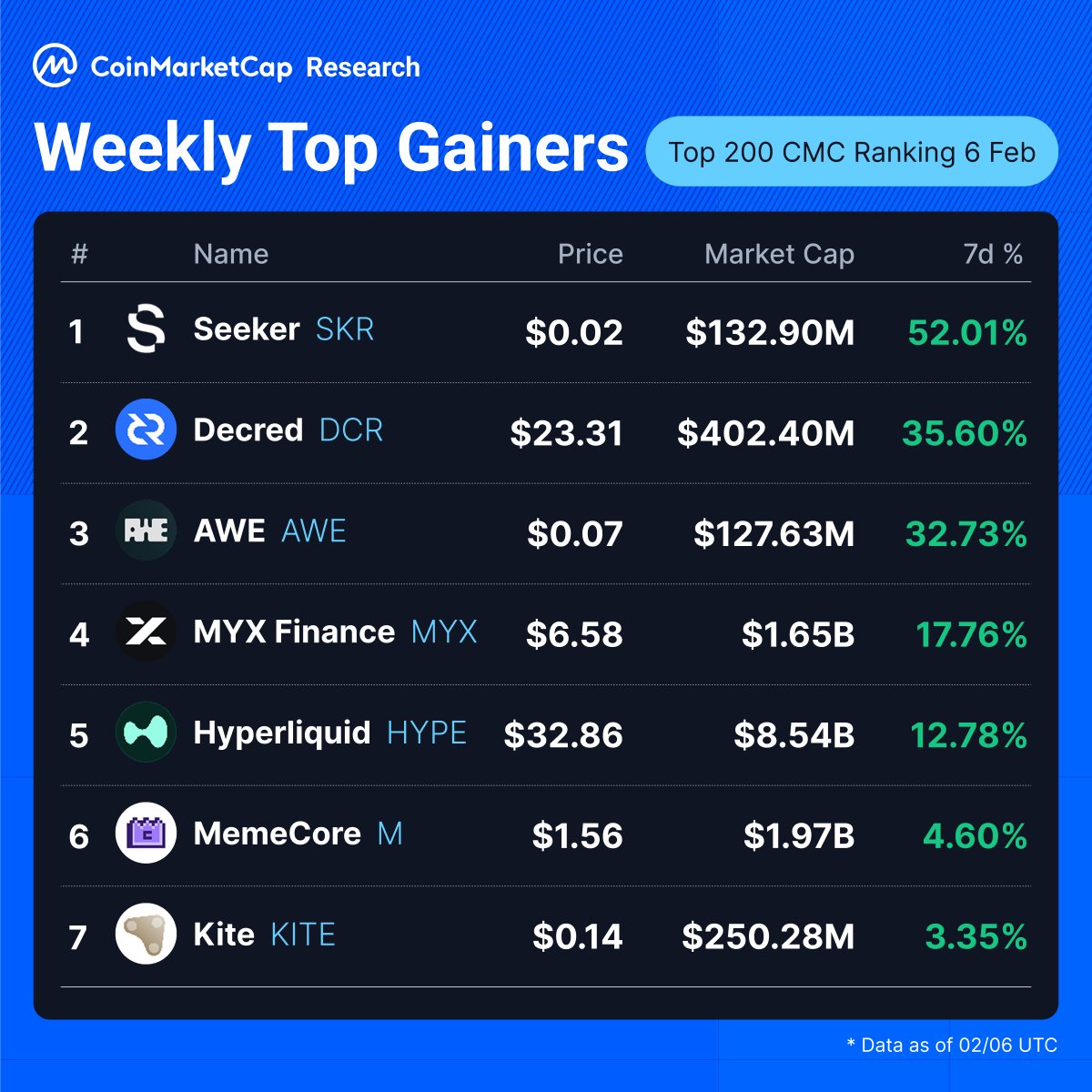 Weekly Top Gainers 1️⃣ Seeker (@solanamobile): +52.01% 2️⃣ Decred (@decredproject): +35.60% 3️⃣ AWE (@awenetwork_ai): +32.73% 4️⃣ MYX Finance (@MYX_Finance): +17.76% 5️⃣ Hyperliquid (@HyperliquidX): +12.78% 6️⃣ MemeCore (@MemeCore_M): +4.60% 7️⃣ Kite (@GoKiteAI): +3.35%