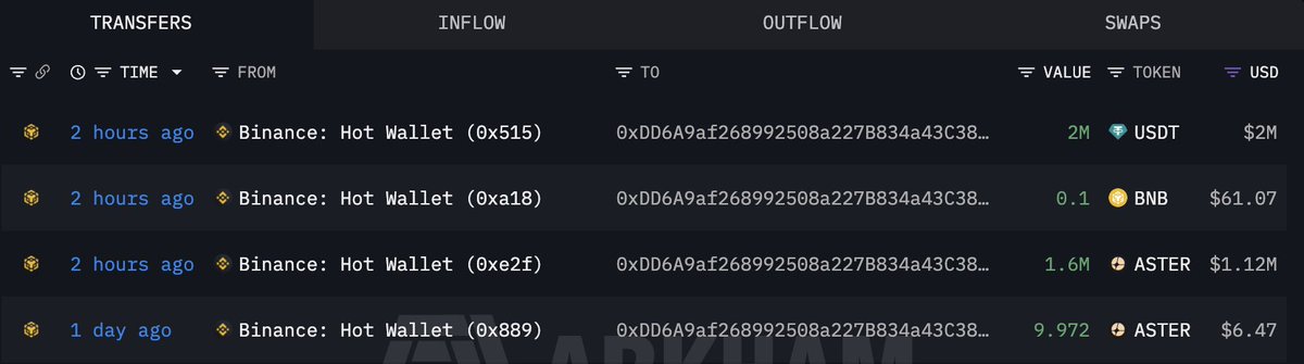 The newly created wallet “0xDD6A” withdrew 1.6 million ASTER tokens (US$1.12 million) from Binance 2 hours ago.