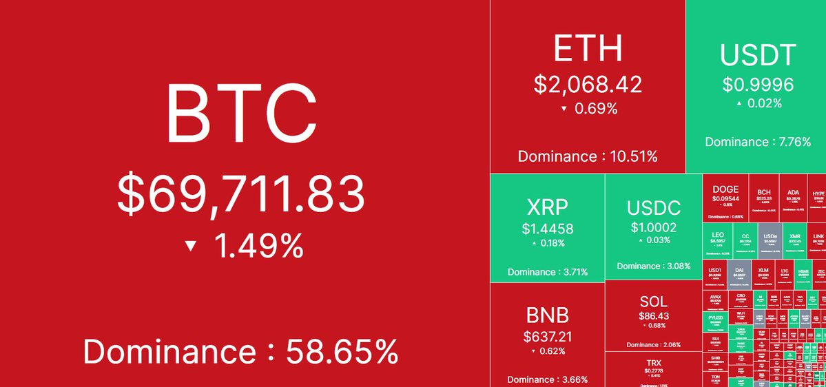 🌐 Daily Cryptocurrency Price Update 🌐 Bitcoin (BTC): $69,711.83 Ethereum (ETH): $2,068.42 Ripple (XRP): $1.4458 Binance Coin (BNB): $637.21 Solarana (SOL): $86.43 Tron (TRX): $0.2778 Dogecoin (DOGE): $0.09544 Bitcoin Cash (BCH): $525.03 Cardano (ADA): $0.2678 Hyperliquid (HYPE): $30.08 Shiba Inu Coin (SHIB): $0.000006054