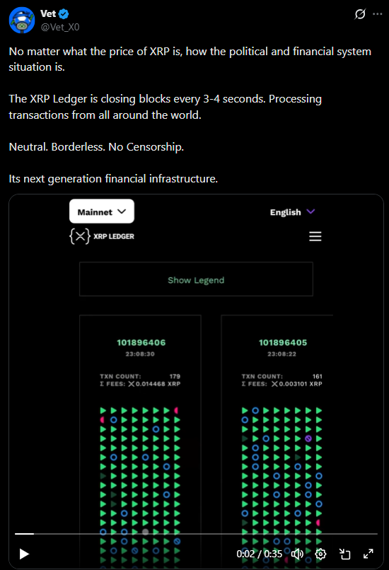 #XRP Unaffected by Price Fluctuations and Political Turmoil: Top Validators 🧵🧵🧵 An XRP ledger validator stated that the network's performance remains stable regardless of XRP price fluctuations or changes in political and financial situations. This comment, from Vet, a validator of XRPL dUNL, highlights the resilience of this leading blockchain. It demonstrates that the ledger's long-term significance stems from its uptime, speed, and decentralized governance, rather than short-term market sentiment. Vet explained in a tweet that despite market volatility and turmoil in the global financial system, XRPL can process and close blocks every three to four seconds, thus validating transactions uninterruptedly. He added that the network's operation is independent of price fluctuations, geopolitical tensions, or changes in the global financial system. Vet further described XRPL as neutral, borderless, and censorship-resistant, emphasizing that it is not controlled by any single country, institution, or ideology. In practice, the ledger continues to function as a global settlement layer, maintaining accessibility and resilience to external pressures. Based on these characteristics, he defines XRPL as the next-generation financial infrastructure. Notably, Vet shared a short video demonstrating how the ledger closes a transaction block in seconds. In context, closing a block on XRPL signifies that independent validators have reached a consensus on the order and outcome of transactions, ultimately determining a new, immutable network state. Unlike Bitcoin mining, XRPL closes a new block in seconds, creating a continuous, high-speed record of network activity. Yesterday, within hours of the US stock market opening, global markets crashed, wiping out trillions of dollars in market capitalization. This decline stemmed from high leverage and escalating tensions between the US and Iran. Bitcoin led the decline, followed by precious metals. Gold and silver, in particular, lost nearly $4 trillion in market capitalization in just one hour. Meanwhile, the stock market was also impacted, with the S&P 500 falling 1.3%, wiping out $800 billion in market capitalization. Other markets, including cryptocurrencies, continued to be under pressure. Specifically, Bitcoin fell 5.97% over the past day, trading below $83,000. Similarly, Ripple (XRP) fell 6.41% in the past 24 hours, trading at $1.75. Amidst a volatile market environment and growing investor frustration…