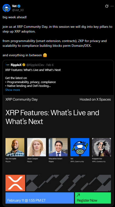 Vet emphasizes that XRP adoption will see significant progress in a "critical week." #Ripple 🧵🧵🧵 The XRP community is preparing for a critical week of XRP adoption. Core developers and the Ripple team are preparing to outline the next phase of development plans for the XRP ledger. XRPL validator Vet expressed his anticipation for XRP Community Day on Twitter, calling the coming days a "critical week" focused on boosting XRP adoption. Vet stated that upcoming discussions will revolve around key tools needed to scale XRP adoption, particularly in institutional and regulated markets. At the heart of the discussions is the programmability of the XRP ledger. Planned discussions will explore smart scaling and contract functionality, designed to extend the capabilities developers can build on XRPL while ensuring efficiency and security. Privacy and scalability are also key areas of focus. Vet specifically highlighted zero-knowledge proofs (ZKP) as a crucial area of development. These tools will enable more private transactions and scalable financial activity, which is crucial for enterprise and institutional users. Another important theme is compliance. XRPL developers are working on compliance-centric building blocks, including enhancements to permissioned domains and decentralized exchanges (DEXs). The goal is to allow compliant financial workflows to run seamlessly in the background without any inconvenience to end users. Vet's presentation followed a RippleX update outlining which XRP ledger features are already live and upcoming. RippleX plans to explain how improvements in programmability, privacy, and compliance directly enhance the practical value of XRP. This meeting will be held at X Spaces during XRP Community Day on February 11th at 1:55 PM ET (February 12th at 2:55 AM Singapore Time). The meeting will cover native lending, DeFi tools, and how these upgrades support real-world financial applications. The focus remains on expanding XRP's role in settlement, liquidity, and on-chain financial services. Speakers include Ayo Akinyele, Head of Software Engineering at RippleX; Mayukha Vadari, Senior Software Engineer at RippleX; and Jazzi Cooper, Head of Product at RippleX. Community members such as Vet and Krippenreiter will also participate. A previous RippleX update outlined a broader institutional DeFi roadmap for the XRP distributed ledger. This roadmap positions XRP at the heart of settlement, foreign exchange, collateral management, and on-chain lending. According to the roadmap, this year's focus is on lending, privacy, and permissioned on-chain markets. These developments aim to make XRP more accessible for everyday institutional use while maintaining a simple and compliant user experience. With XRP Community Day approaching...