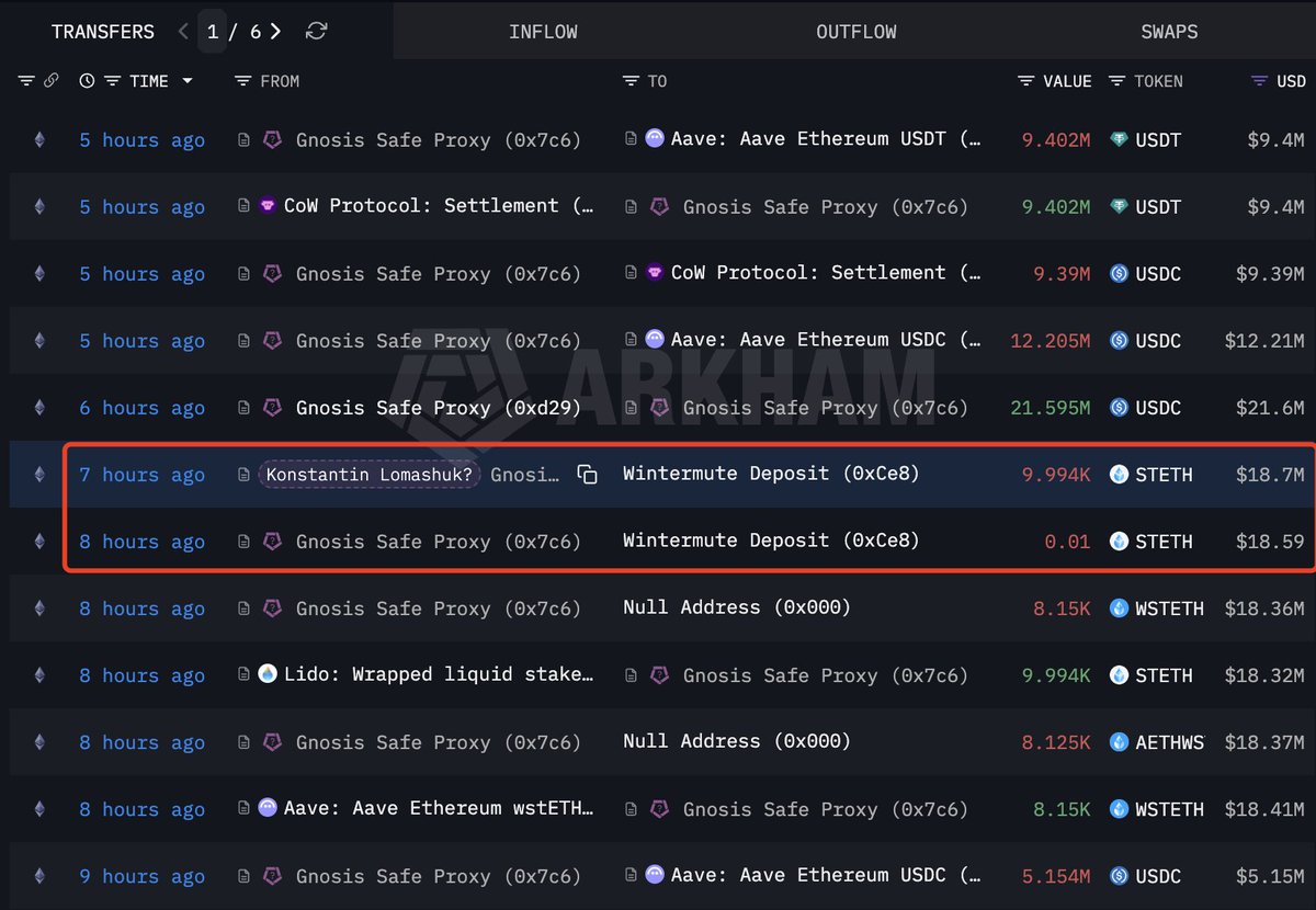 Konstantin Lomashuk (@Lomashuk), a well-known Ethereum ($ETH) holder and staker and co-founder of Wintermute, appears to be selling off his Ethereum holdings. Two wallets possibly associated with him sent 12,458 $stETH (worth $23.76 million) and 2,566 $ETH (worth $5.38 million) to Wintermute, respectively.