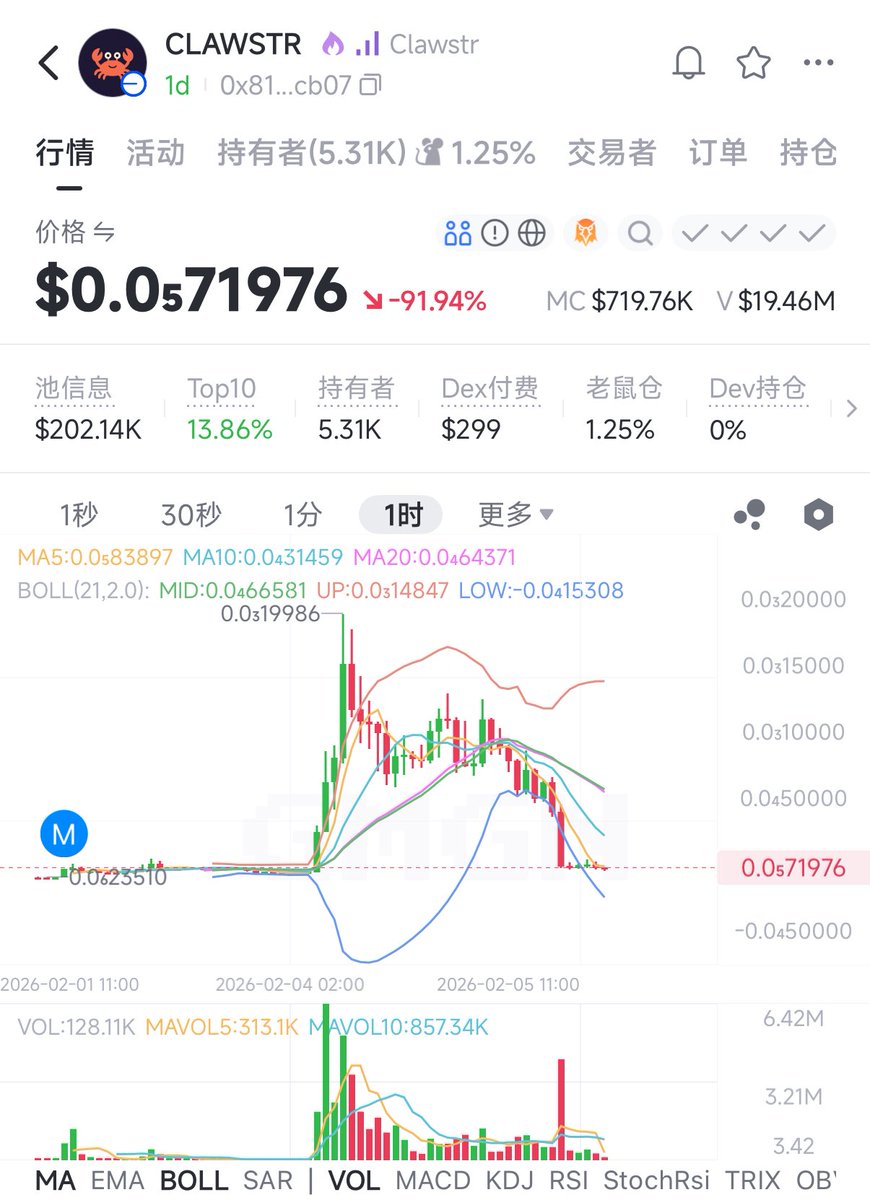 Plunge! Meme coin $CLAWSTR's market capitalization plummeted 95% in a single day, with multiple addresses that profited yesterday exiting the market. According to GMGN monitoring, at 8:00 AM today, the market capitalization of the Base @base ecosystem's #Meme coin $CLAWSTR plummeted by 87% in a short period. Compared to yesterday's high, its cumulative drop has reached 95%, with a current market capitalization of only about $720,000, a 90% drop in 24 hours. Data shows that many addresses that bought in early and had previously made a profit chose to liquidate their positions at a loss during this sell-off. Among them, trader address "0xdc5" had accumulated a position of $175,000 when the market capitalization reached $13.5 million, and initially recorded a profit. Ultimately, after the unrealized loss widened to 70%, it cut its losses and exited the market, recording a loss of approximately $124,000. Furthermore, addresses such as "0x090" and "0xca6" also exited at a loss during this decline after buying in early on or adding to their positions during pullbacks. 🚨Meme coin was jointly issued by Nostr founder Derek Ross and Bitcoin ecosystem developer Alex Gleason. As a community support token, it surged to a market capitalization of $19.9 million yesterday. ⚠️Meme coin trading is highly volatile, heavily reliant on market sentiment and hype, and has no real value or use cases. Investors should be aware of the risks.