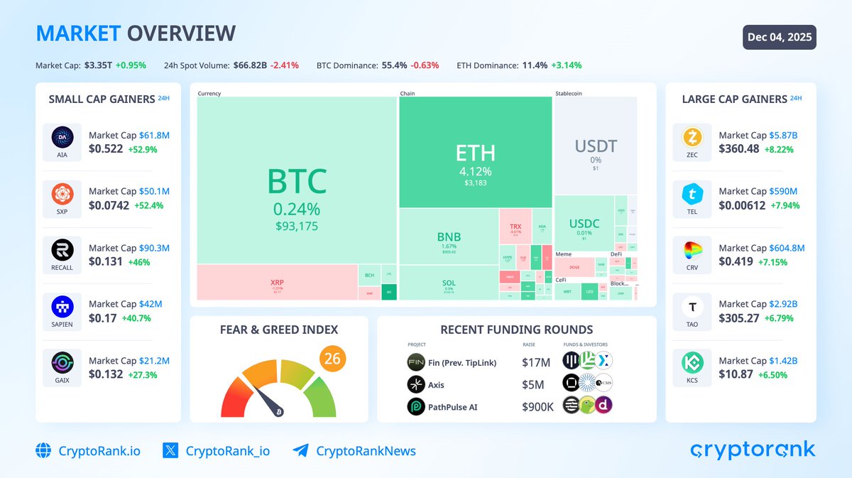 Market Overview The cryptocurrency market continued its growth, driven by optimism and a lack of negative macroeconomic news. However, ETF inflows for Bitcoin ($BTC) and Ethereum ($ETH) remained limited. $BTC $93,462 (+0.4%) $ETH $3,190 (+4.3%) Major altcoin gains: $ZEC +8%, $TEL +8%, $CRV +8%, $KCS and $TAO +7%. Market Cap: $3.36 trillion | Liquidation Amount: $318 million | Financial Market Index (FGI) 28 (Fear Sentiment) | Altcoin Index 21/100 Small-Cap Coin Gains: $RZTO +55%, $RECALL +54%, $SXP +53%, $SAPIEN +43%, $AIA +38% News: 🧠 CryptoQuant stated that its strategy is to combat the bear market by reducing its Bitcoin ($BTC) purchases. 📱 Solana Mobile will launch the $SKR token in January. 📊 Polymarket officially launches its app in the US.