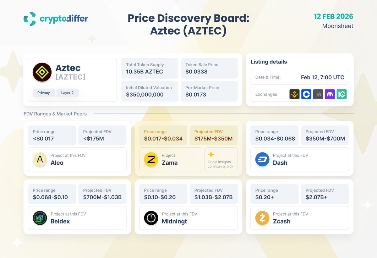 Price Discovery Board: @AztecNetwork $AZTEC The #AZTEC board, which began trading today at 7:00 UTC, has raised $217 million in funding. This board uses benchmark data from other privacy projects such as #Zama, #Zcash, and #Midnight to compare potential Full Settlement Value (FDV) options.