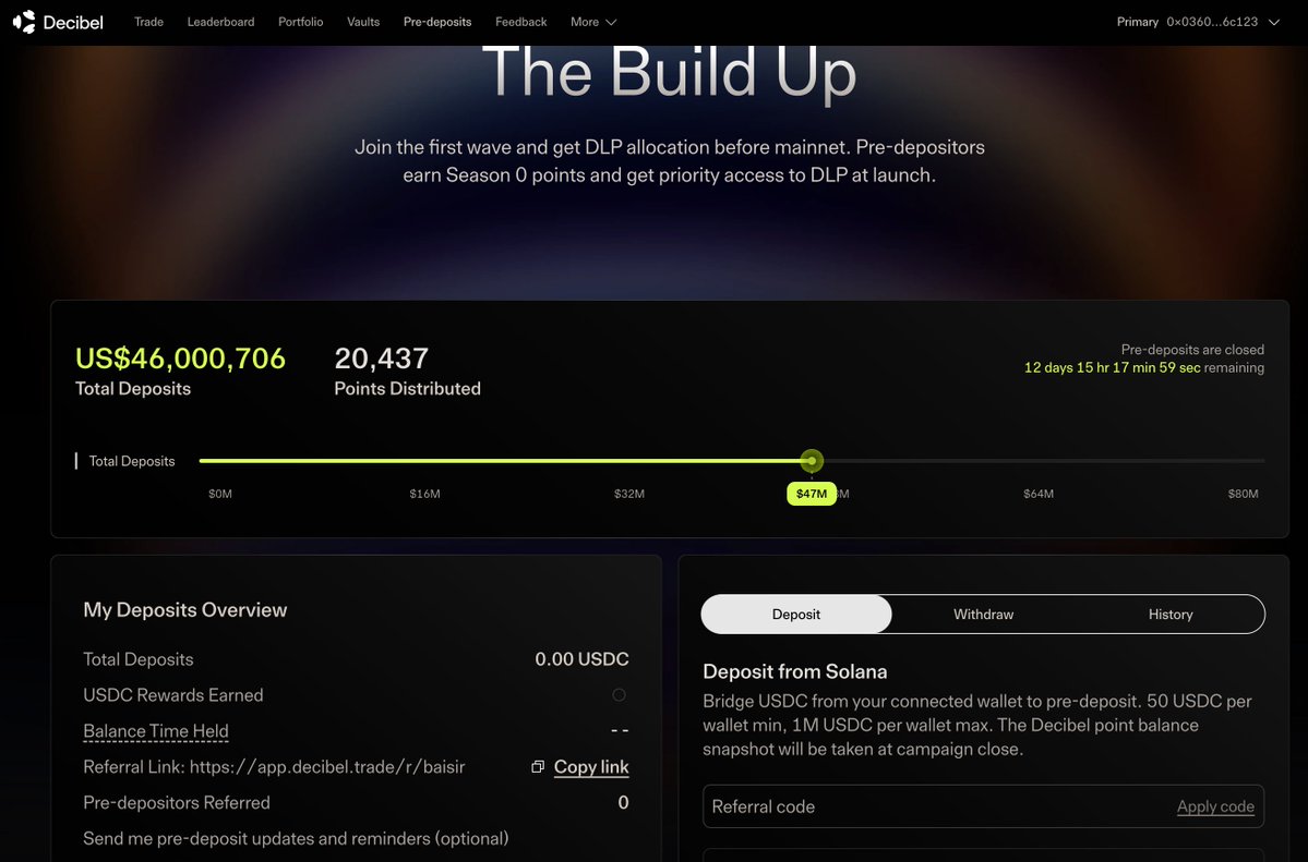 DeFi enthusiasts, @DecibelTrade, the "golden child" of @Aptos, is now offering pre-deposits! Join now! 🎁 Pre-deposits grant you access to the mainnet! 💵 Guaranteed minimum investment of $50, which you can withdraw later! Currently, pre-deposits have surged to over 40M, making it a worthwhile early entry from an investment research perspective! After the expected launch on February 26th, users will have 24 hours to join your team by depositing $10 (withdrawable after Phase 3 launch). ✅Link: My code is: baisir, you can also enter it manually.
