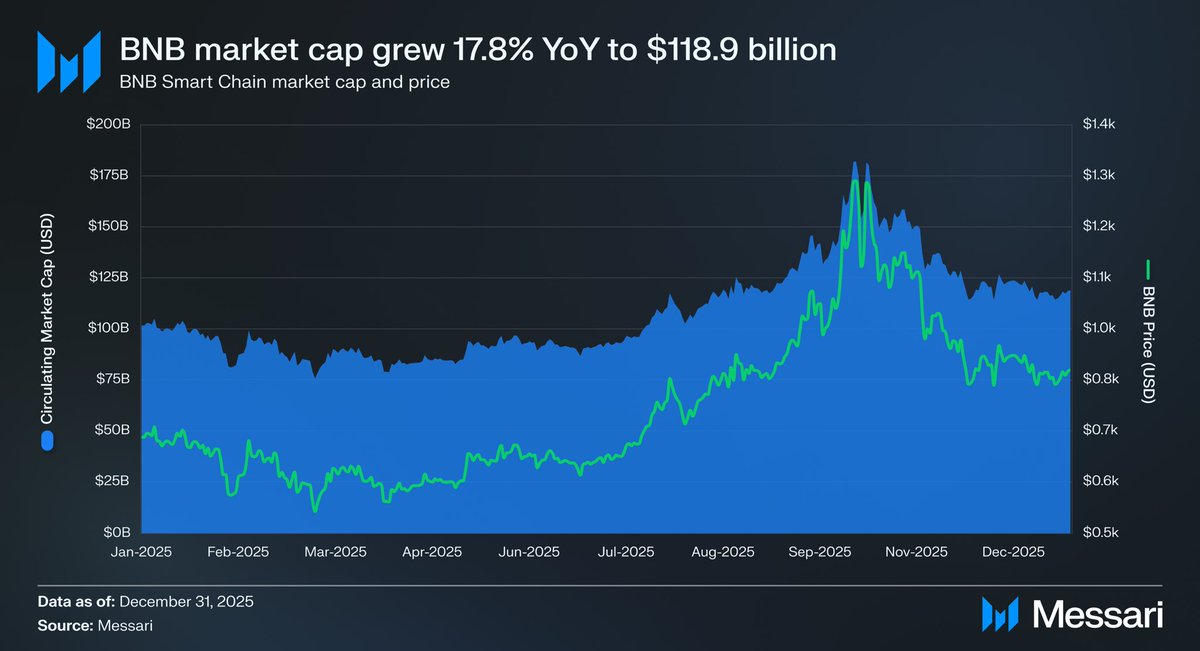 BNB's market capitalization reached $118.9 billion by the end of 2025, a 17.8% year-over-year increase, making it the third-largest cryptocurrency by market capitalization. Today, @ahbeaudry released our BNB Chain Q4 2025 report. Here are the key highlights of the report 🧵 Daily transaction volume increased by 30.4% quarter-over-quarter to 17.3 million, and daily active addresses increased by 13.3% to 2.6 million. Even excluding the volatility peak in October, baseline activity was still higher than in Q3. RWA became the most significant growth driver. The total value of on-chain RWAs reached $2 billion, a 228% quarter-over-quarter increase and a 555% year-over-year increase, making BNB Chain the second-largest RWA network after Ethereum. This growth was primarily driven by deployments by large institutions, including USYC, BlackRock's BUIDL, and China Merchants International. The market capitalization of stablecoins increased by 9.2% quarter-over-quarter, reaching $15.2 billion. The top three stablecoins by market capitalization in Q4 were: 1. USDT - $9 billion (up 12.4% quarter-over-quarter) 2. USD1 - $1.9 billion (down 12.6% quarter-over-quarter) 3. USDC - $1.3 billion (up 23.1% quarter-over-quarter) BNB's DeFi TVL reached $6.6 billion at the end of Q4, with @PancakeSwap accounting for 33.5% of the market share. Click here to read the full "BNB Chain Q4 2025 Report".