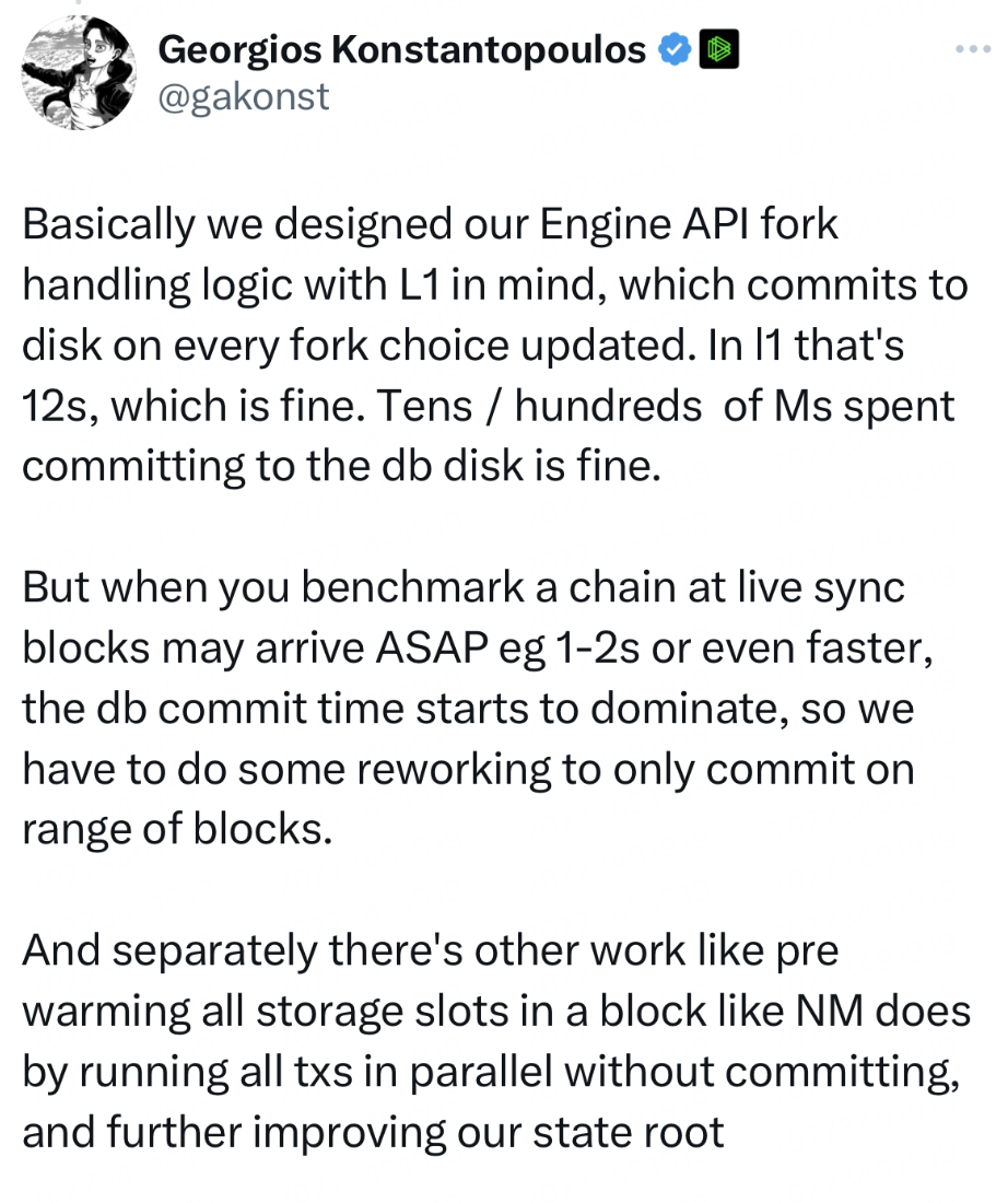 In the BNB Chain 2024 tech roadmap, building the highest performance EVM platforms stands as a crucial milestone. Paradigm Reth's proposal for achieving 1 gigagas per second and beyond shares a similar mission with BNBChain. In the short term, the team will be incorporating the optimization experience we have accumulated on BSC/opBNB Geth into the Reth client, including parallel prefetch, fast finality, multi layer cache.