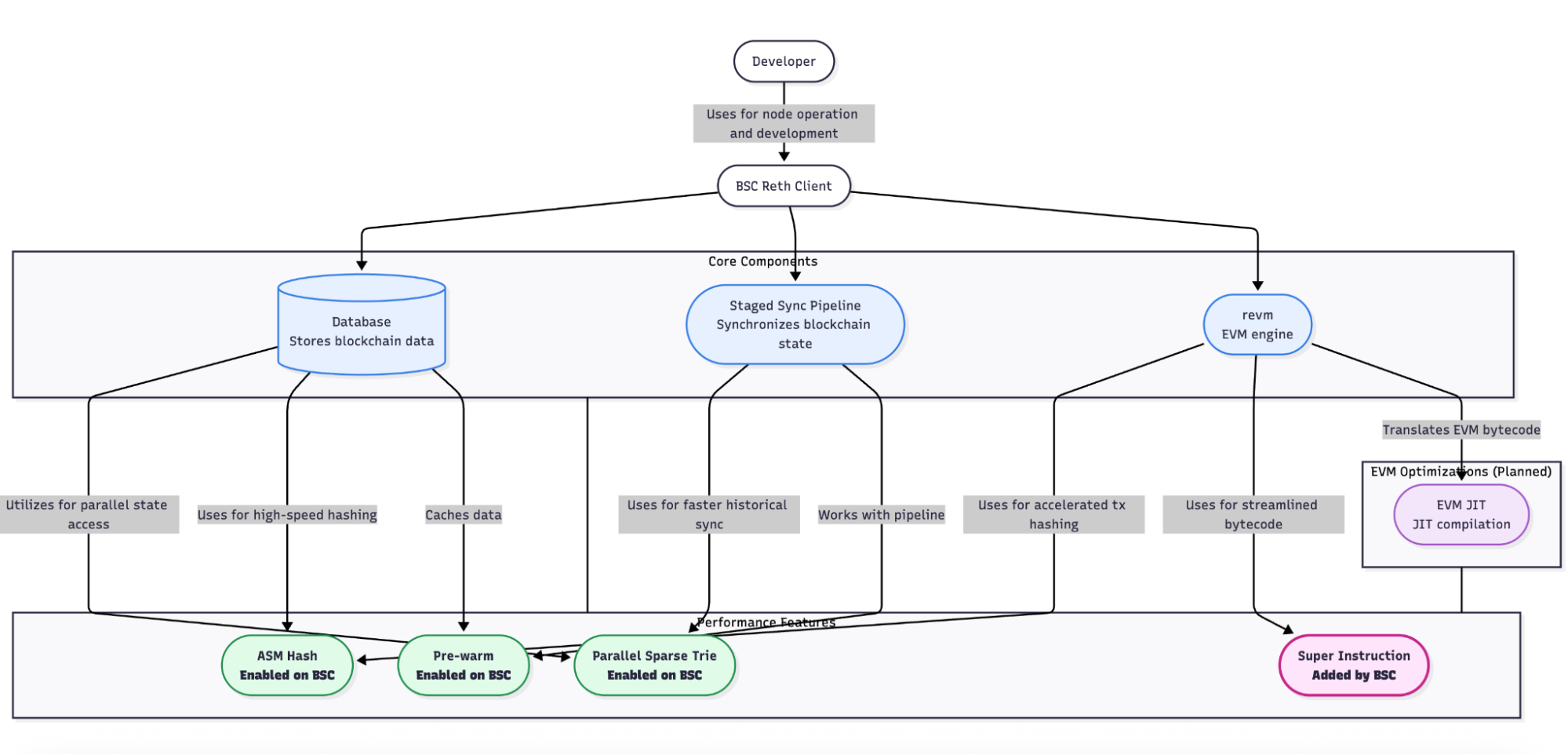 Achieving 1G gas per second under a 750ms block time requires more than incremental changes — it demands the elimination of bottlenecks across every layer of the client. Thanks to Reth’s modular architecture, BSC Reth introduces targeted optimizations across execution, state management, and reliability.