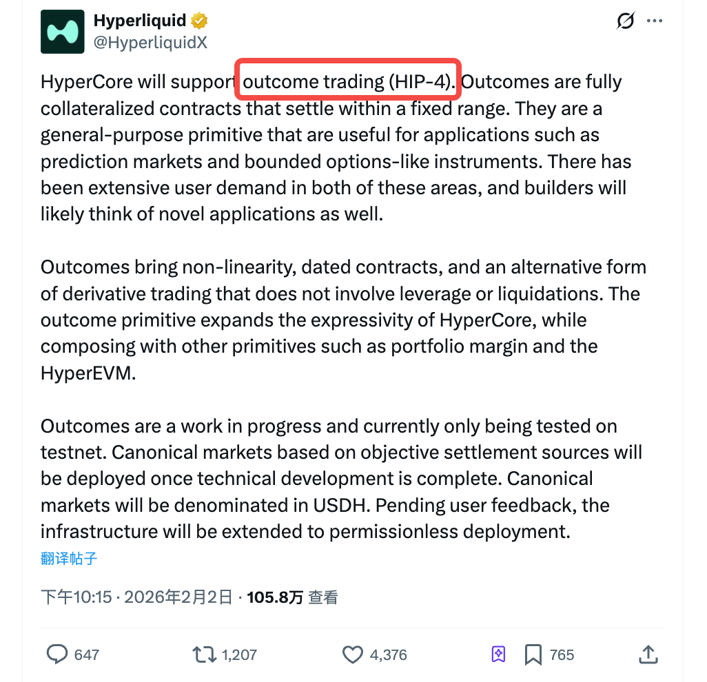 On February 2nd, Hyperliquid announced the launch of its HIP-4 testnet. The official description is "outcome trading," meaning fully collateralized contracts that settle within a fixed price range, suitable for prediction markets and options-like products.