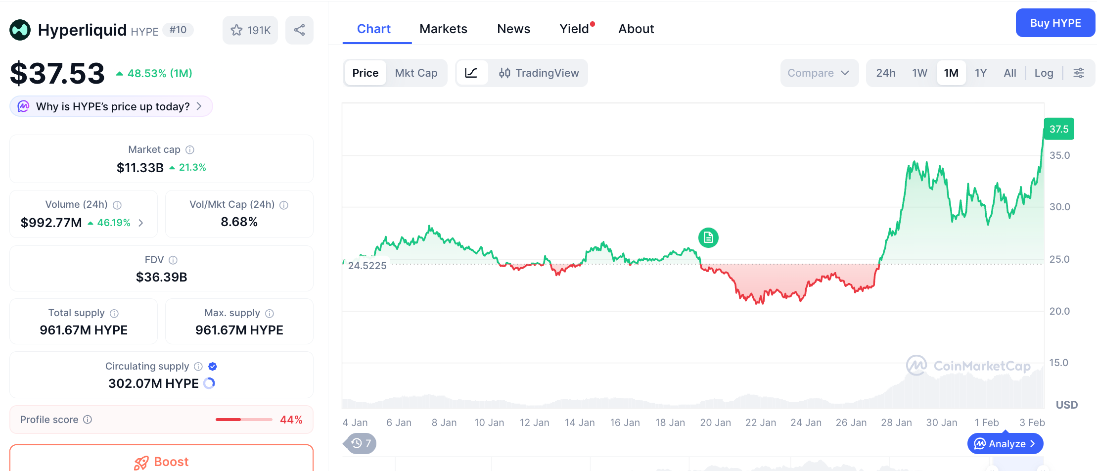 HYPE has risen more than 40% in the past week. While the broader market is bleeding, HYPE is bucking the trend.