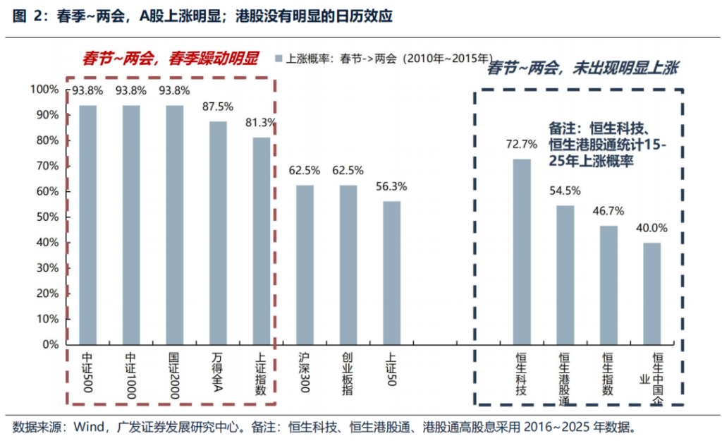 A-shares spring rallyThe surge typically occurs between the Spring Festival and the Two Sessions. This is because investors reduce their positions to avoid the uncertainties during the Spring Festival holiday, and these positions may return after the holiday. At the same time, the period leading up to the Two Sessions is often a time when expectations for reforms and easing policies are relatively high.