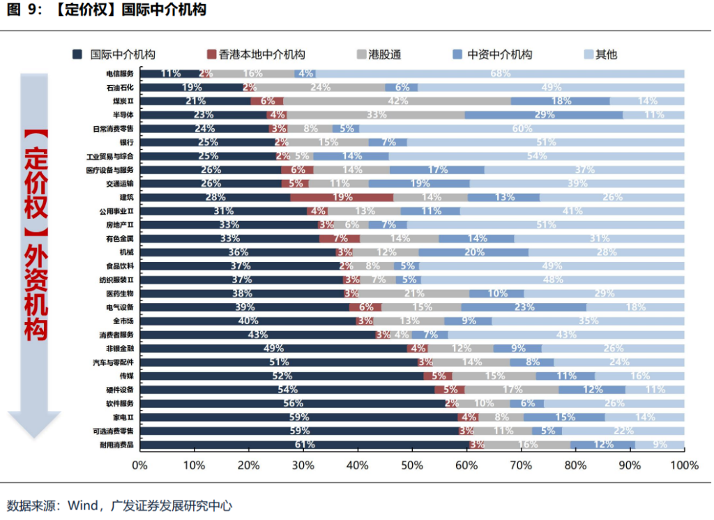 Foreign companies have pricing power in the following sectors: durable consumer goods (Pop Mart), discretionary consumer retail (Alibaba, Meituan, JD.com), home appliances (Midea, Haier), software services (Tencent, NetEase, Baidu), hardware equipment (Xiaomi, Lens Technology), and media (Kuaishou, Tencent Music, NetEase Cloud).