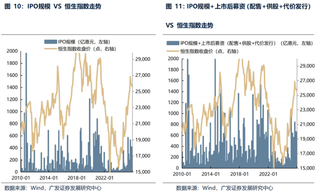 The peak in IPO size and fundraising (including post-listing fundraising, i.e. placement + rights issue + consideration issuance) will not reverse the trend of Hong Kong stocks.Typical examples include the fundraising peaks in Hong Kong stocks in 2010, 2014-2015, 2017, 2020, and 2025, none of which affected the bull market in Hong Kong stocks. This may be because the Hong Kong stock market has improved significantly, and some companies have expansion needs, choosing to raise funds in the capital market at relatively high points.