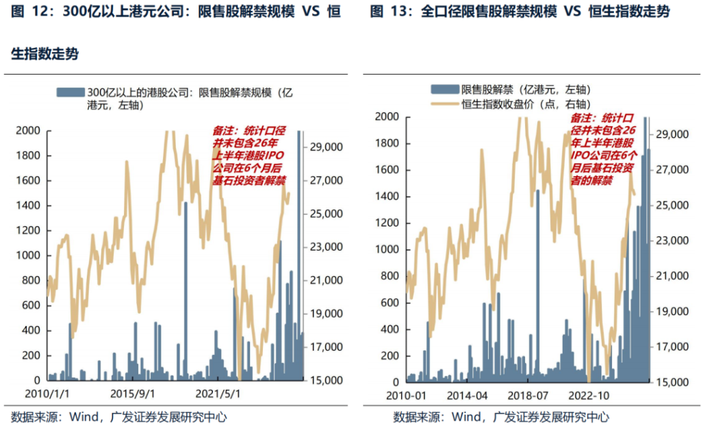 (4) Record volume in Hong Kong stocksThe IPO itself has little impact on the market; the main impact comes from the peak of share lock-up expirations six months after the IPO.Typical examples include mid-2011, the second half of 2015, March 2019, the second quarter of 2021, and mid-2022, where the unlocking of lock-up periods coincided with declines in Hong Kong stocks. The March 2026 unlocking was primarily driven by non-ferrous metals (Zijin Mining International, Nanshan Aluminum International) and tea beverages (Mixue Ice Cream), with the unlocking scale of medium-to-large-sized companies reaching HK$87.2 billion, higher than the small peak at the end of last year.Since Hong Kong Stock Connect accounts cannot participate in IPOs and enjoy the listing benefits of scarce companies, but must bear the risks brought by the lifting of restrictions on the sale of shares, this may indeed be one of the main concerns of southbound funds regarding Hong Kong stocks in 2026.