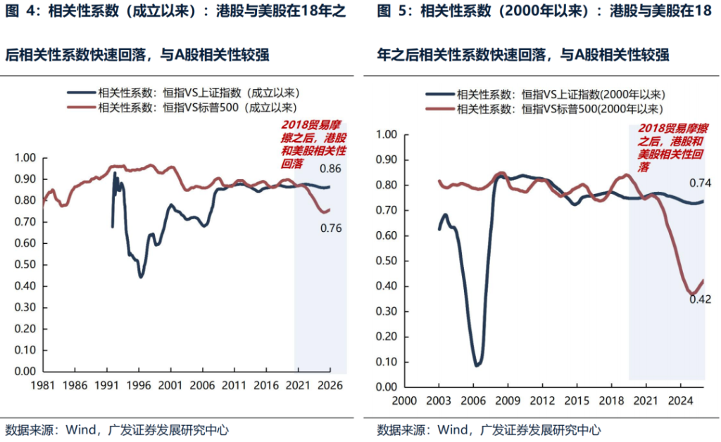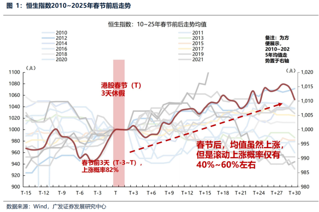 GF Securities Strategy indicates that the Hang Seng Index has an 82% probability of rising in the three trading days before the Spring Festival. After the festival, there is no significant calendar effect, with the probability of an increase only between 40% and 60%. The typical window of opportunity between the Spring Festival and the Two Sessions does not naturally favor Hong Kong stocks. However, this time may be different. The pricing logic of Hong Kong stocks has been changing in recent years, with a stronger correlation between Hong Kong and A-shares and a weaker correlation with US stocks. There is a possibility that Hong Kong stocks may experience a certain degree of "passive following" upward movement, as seen after the Spring Festival in 2024 and 2025.