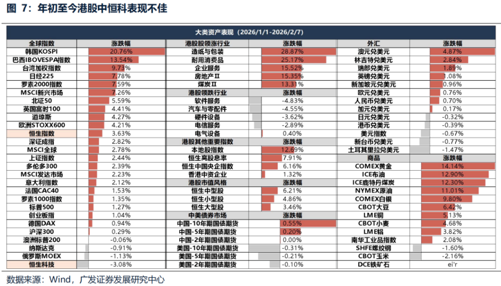 1. Hong Kong stock market liquidity has been under pressure recently, but there are signs that the marginal pressure has eased.Last week, foreign capital experienced a temporary outflow, mainly due to two factors: firstly, the continued deadlock in US fiscal spending and the risk of a partial government shutdown temporarily suppressed risk appetite; secondly, the market overreacted to personnel changes at the Federal Reserve, although Warsh was considered a potential hawk, his policy proposals had already been priced in by the market. We believe that the current liquidity environment has entered a period of observation, and there is limited room for further tightening.