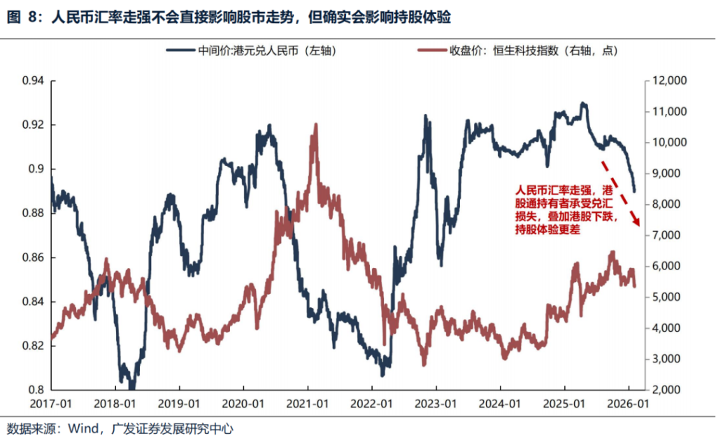 Since the beginning of the year, the Hong Kong stock market has shown a structural divergence. While the Hang Seng Index has recorded gains, its performance has significantly lagged behind major emerging markets such as South Korea and Brazil, and the Hang Seng Tech Index has bucked the trend and fallen. For RMB investors investing through the Stock Connect program, the experience is under double pressure: on the one hand, the overall excess returns of Hong Kong stocks are limited, with key sectors such as technology experiencing corrections; on the other hand, the exchange rate has also had a significant negative impact. During this period, the RMB appreciated by 0.70% against the US dollar, while the Hong Kong dollar, due to its linked exchange rate system, fluctuated with the US dollar and showed a depreciation trend against the RMB. This resulted in Hong Kong stock assets denominated in Hong Kong dollars incurring additional exchange losses after being converted back to RMB, further eroding the investment returns denominated in local currency. However, considering the People's Bank of China's large foreign exchange reserves and powerful management tools, one of its policy objectives is to maintain the basic stability of the RMB exchange rate at a reasonable and balanced level. If the RMB experiences a short-term, rapid appreciation, the central bank is highly likely to intervene to smooth out fluctuations. This institutionally limits the space for a long-term, unilateral, and significant appreciation of the RMB, and the RMB does not have the basis for a long-term, significant, unilateral appreciation.