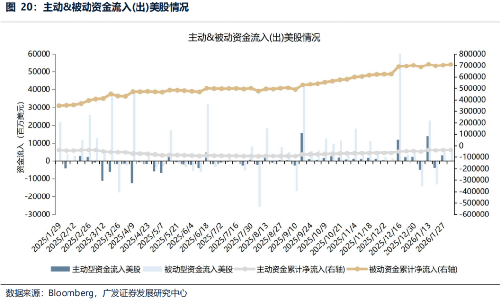 The inflow of active and passive funds into US stocks has converged.As of Wednesday (January 28 - February 4), active funds flowed into US stocks by $220 million, down from $3.217 billion last week; passive funds flowed into stocks by $5.61 billion, down from $6.009 billion last week.