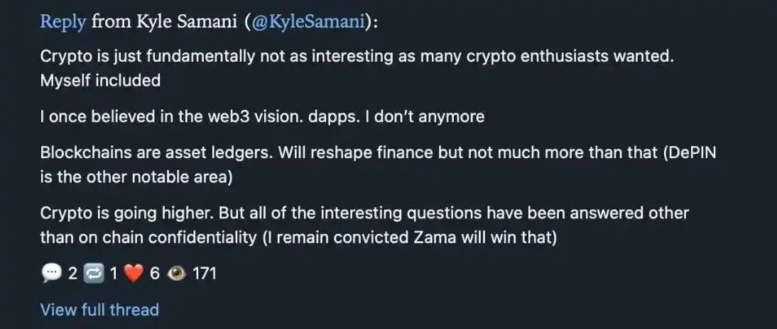 On the day he withdrew from the crypto space, Kyle Samani, in a reply to Stix founder Taran, stated: "Cryptocurrency is not as interesting as many people (including myself) once imagined. I used to believe in the vision of Web3 and DApps, but now I don't. Blockchain is essentially an asset ledger; it will reshape finance, but that's about it, and it won't have much more impact."