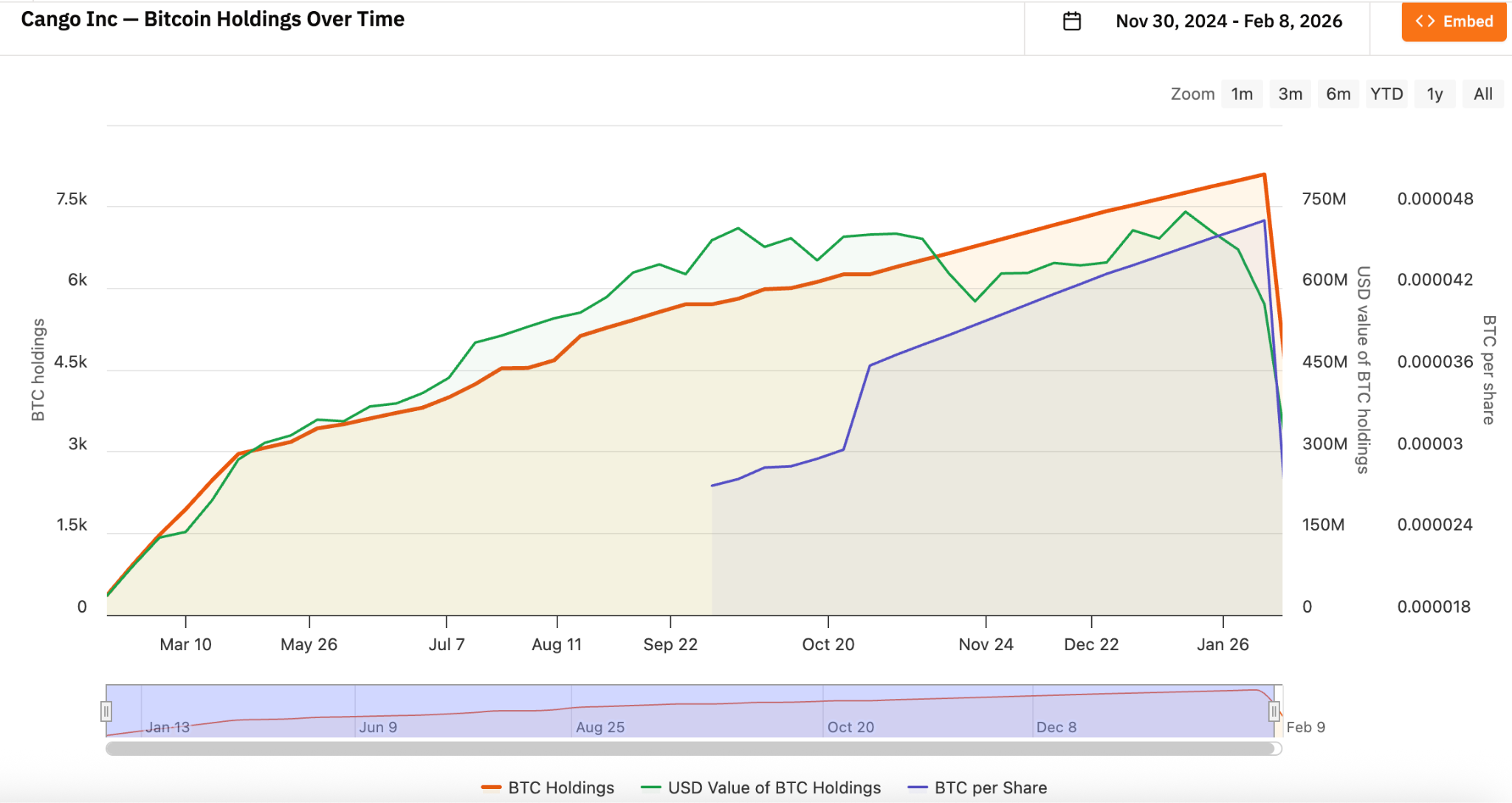 On February 9, Cango disclosed that it had sold shares on the open market.4451 BitcoinsNet income approximately305 millionThe US dollars were used to repay a loan secured by BTC.This transaction is close to half of its previous holdings.After the sale, only 3645 BTC remained in the account.