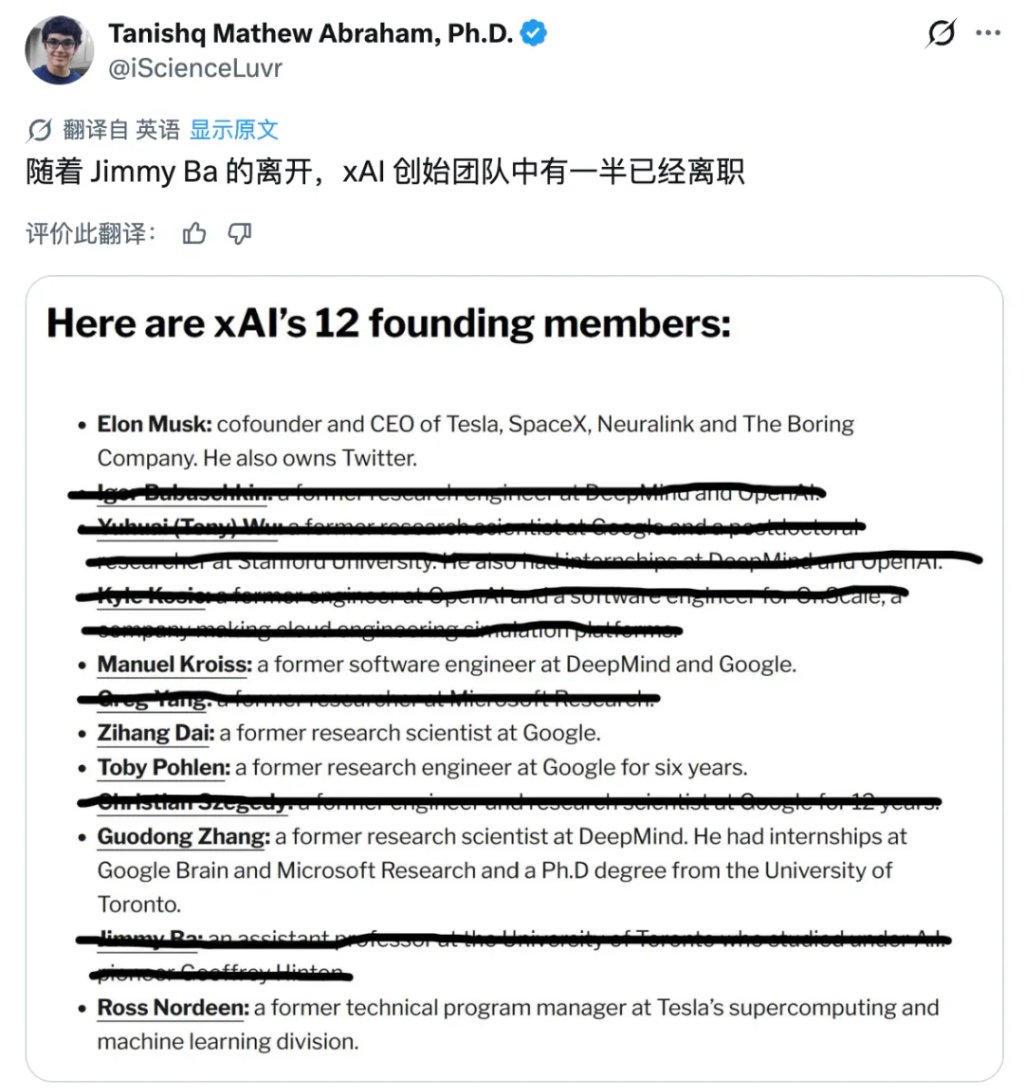 On February 10, co-founder Jimmy Ba, machine learning PhD Vahid Kazemi, multimodal project leader Hang Gao, and Macrohard founding team member Chace Lee, among others, all bid farewell.
